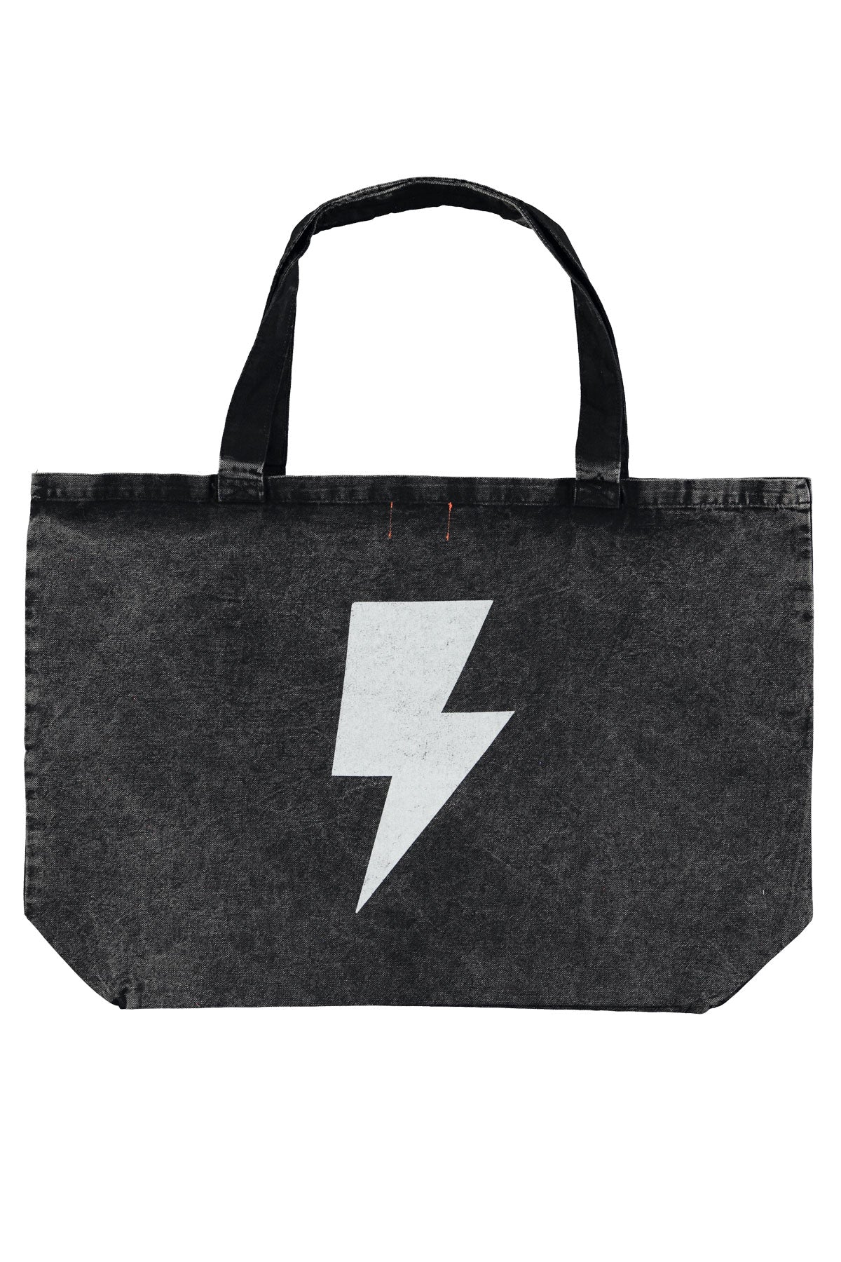 Grand sac couleur noir délavé et imprimé "Rock & roll" d'un côté et un éclair de l'autre.