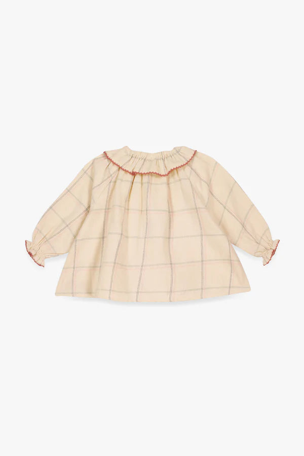 Blouse en flanelle de coton doux avec col volanté et manches bouffantes. Imprimé "carreau winter" et surpiqûres rouges.