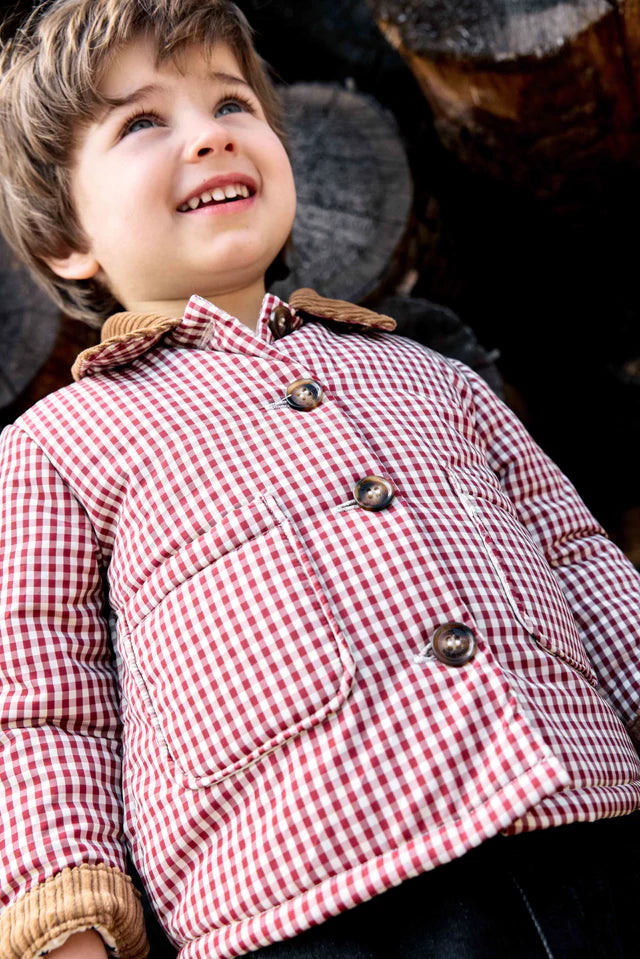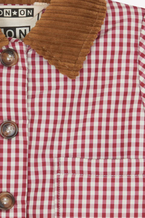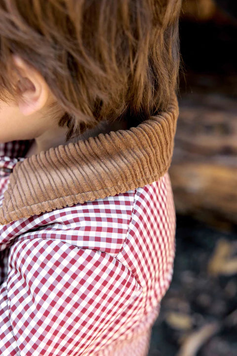 Veste Marcel en vichy rouge et blanc, col en velours marron. Poches pratiques.