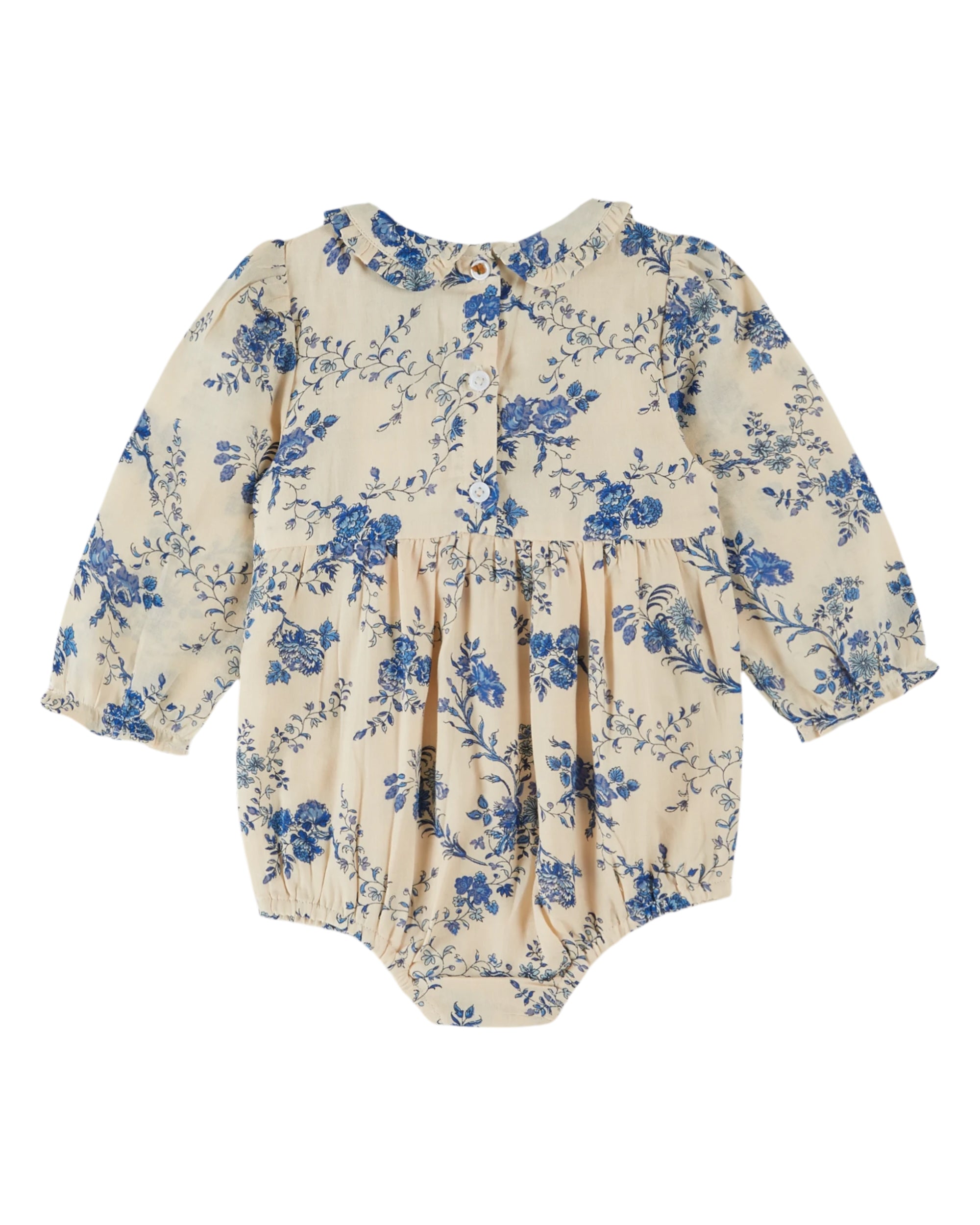 Barboteuse manches longues avec col Claudine et détail smocké sur le buste. Boutons à l'entrejambe et dans le dos.