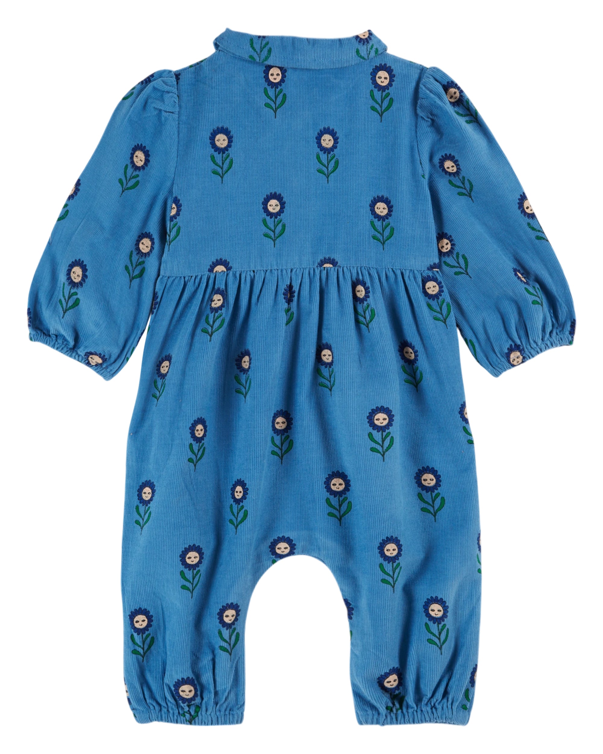 Combinaison manches longues en velours côtelé bleu avec imprimé fleurs. Boutons sur le devant et à l'entrejambe.