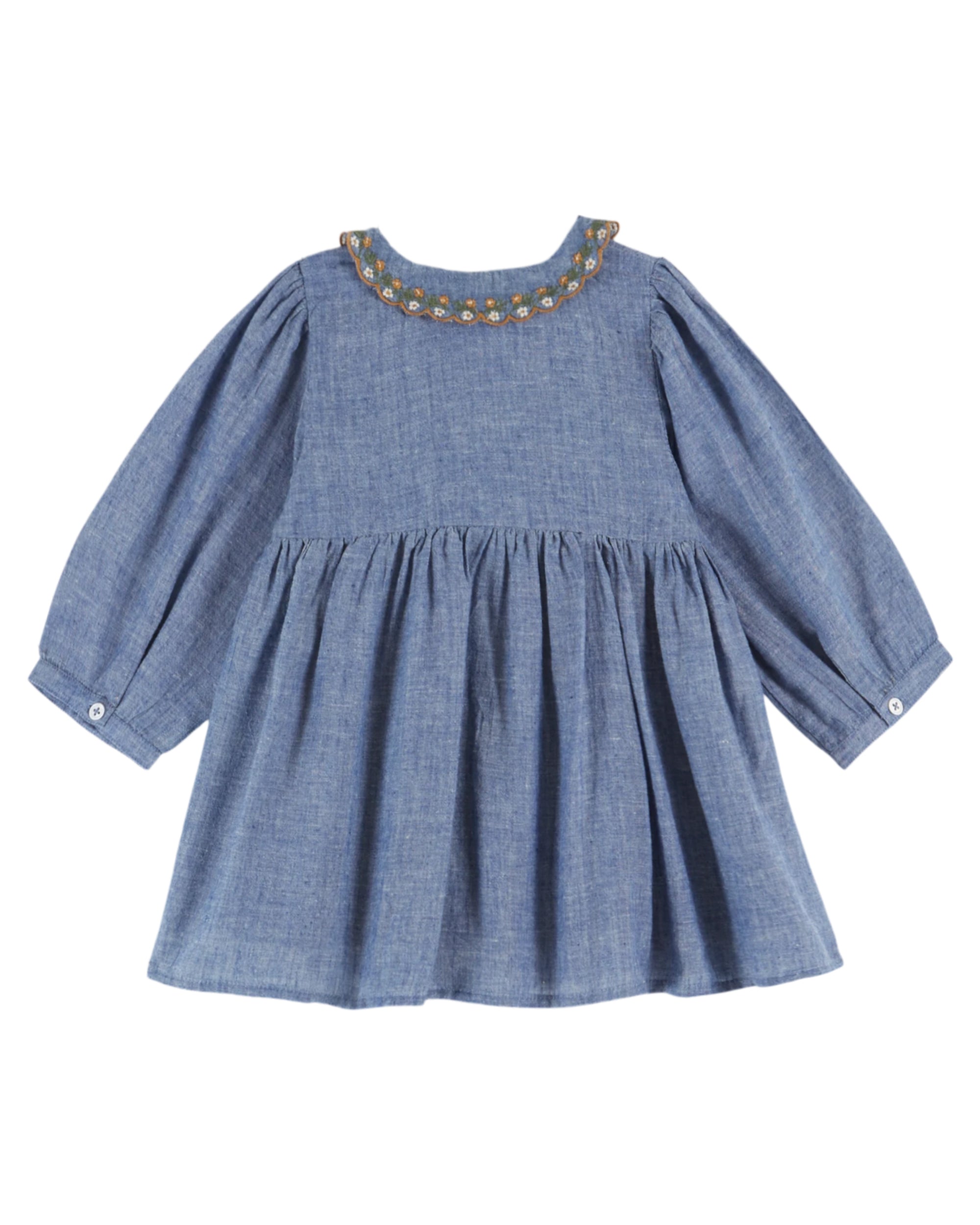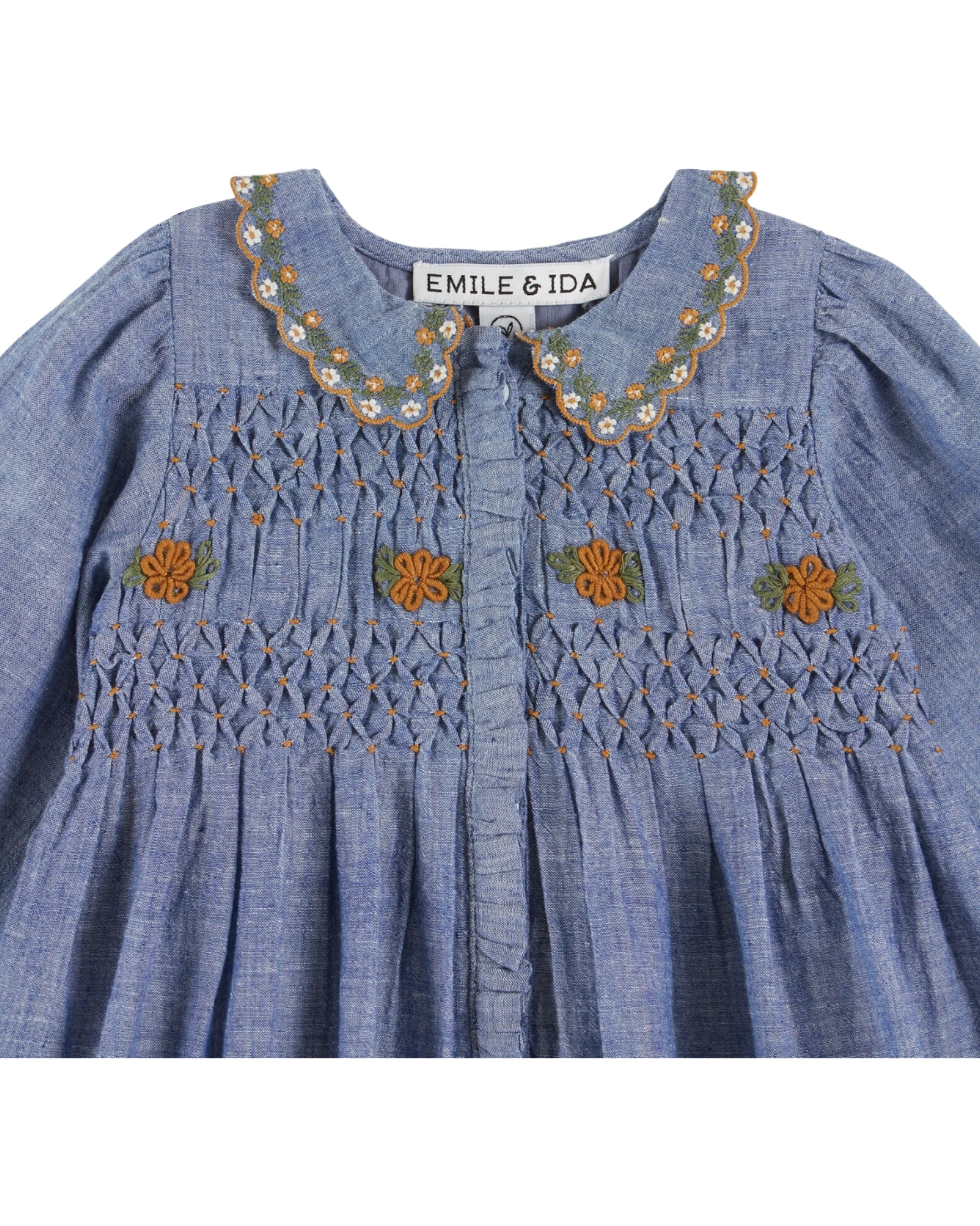 Robe en jean souple avec smock sur la poitrine, col Claudine et détails fleurs brodées sur le devant.