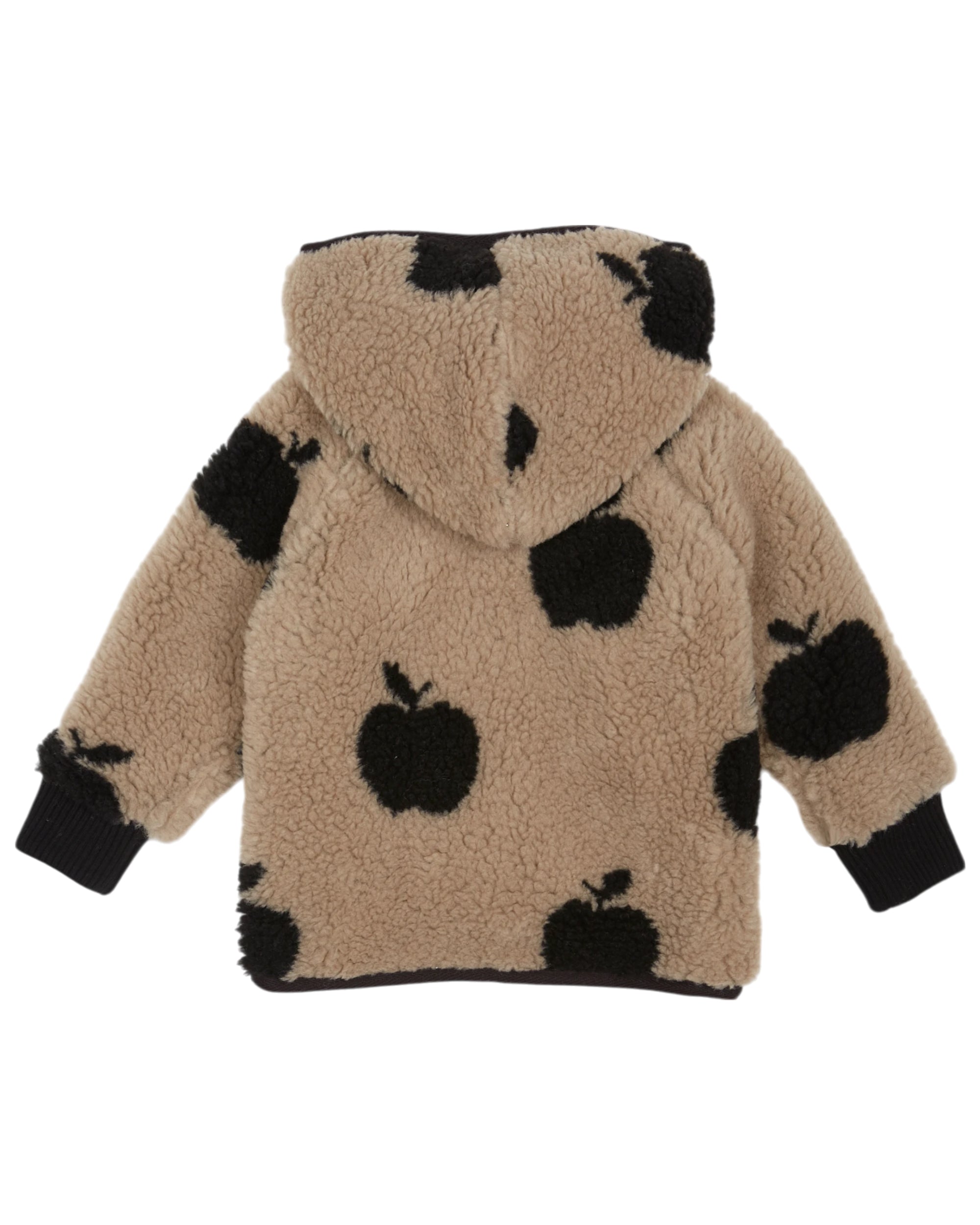 Veste à capuche en fausse fourrure beige avec imprimé pommes. Boutons sur le devant.
