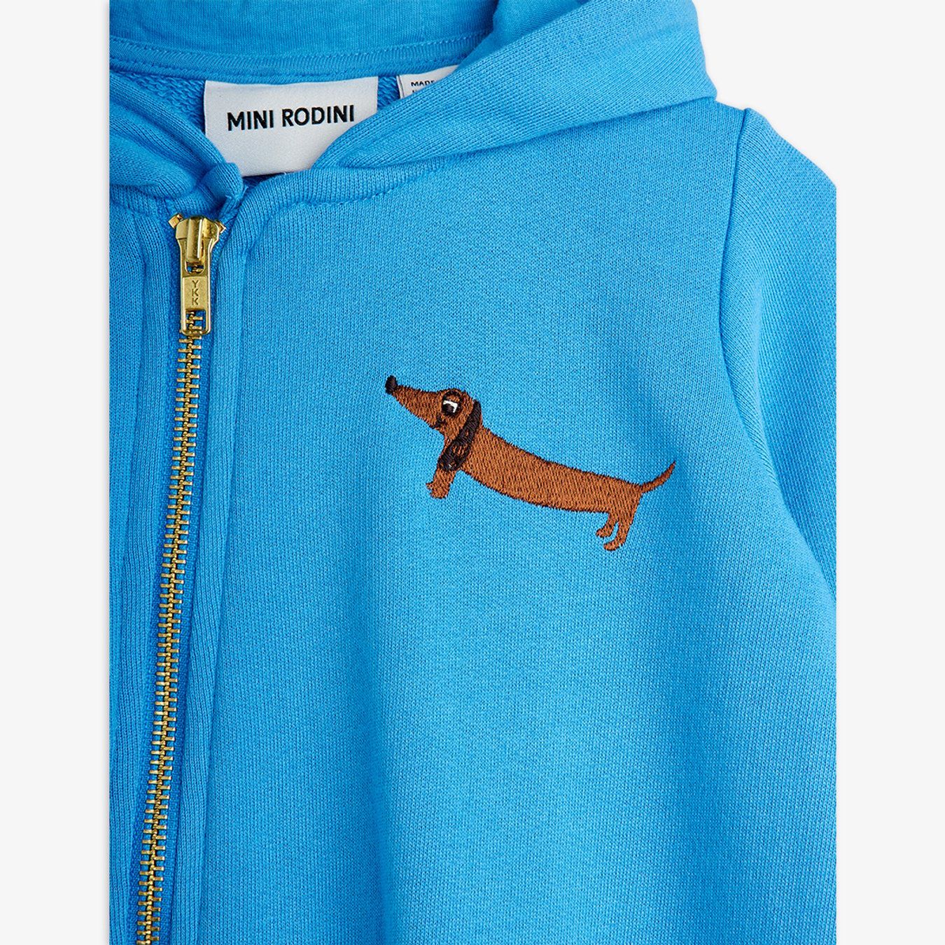 Combinaison bébé avec chien brodé, 100 % coton biologique certifié GOTS. Il est doté de revers aux manches et aux jambes, ainsi que d'une fermeture éclair asymétrique