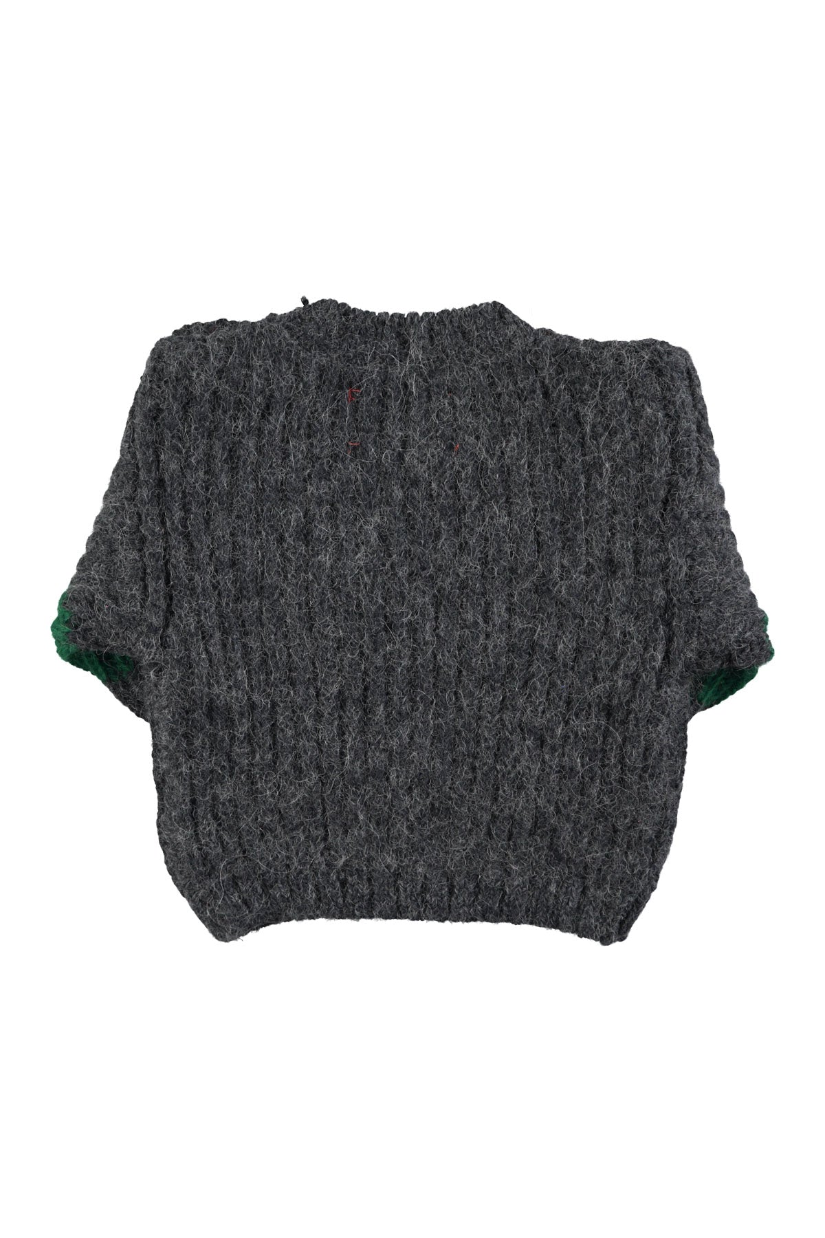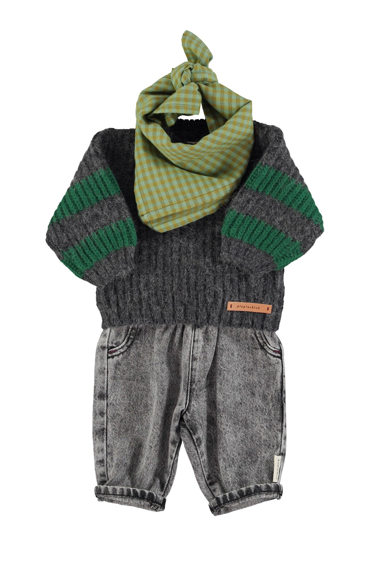 Pull en tricot doux gris avec rayures vertes sur les manches. Boutons sur l'épaule pour faciliter l'enfilage.
