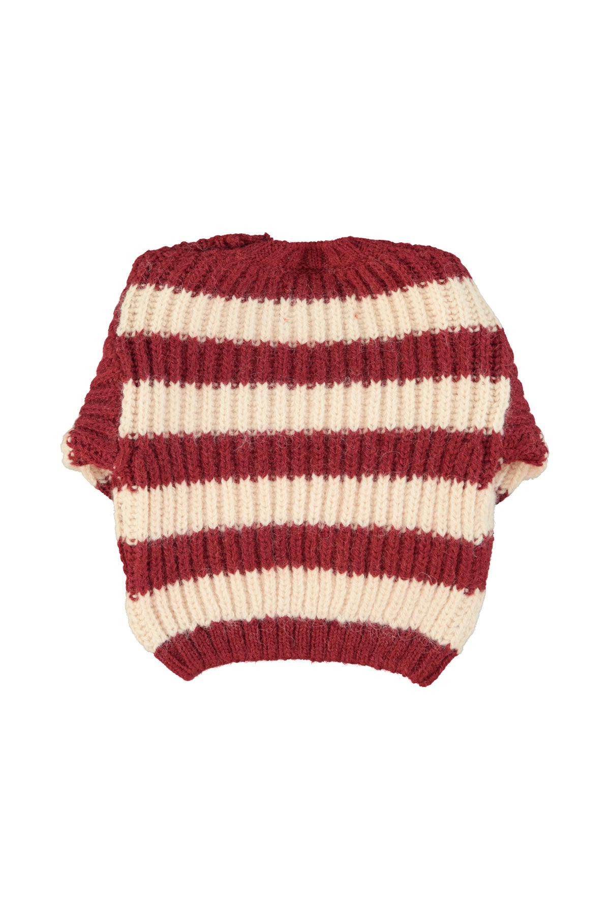 Pull en tricot doux à rayures bordeaux et rose clair. Boutons sur l'épaule pour faciliter l'enfilage.