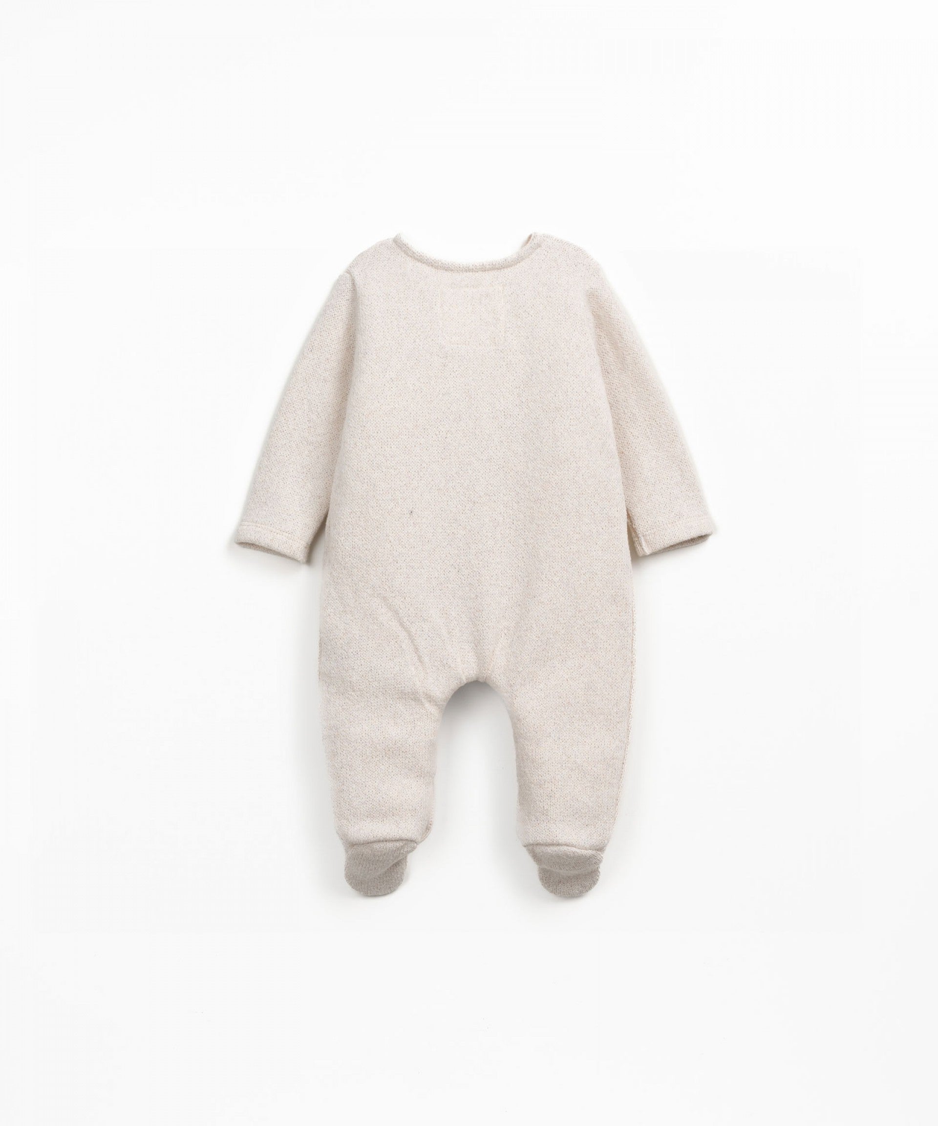 Cette combinaison est en maille avec un mélange de coton régénératif et de coton recyclé, de couleur Blanc Cassé. Le modèle a un intérieur gratté, des manches longues et des pieds intégrés. Elle comporte une ouverture croisée avec un lien à l'extérieur et un bouton-pression à l'intérieur, ainsi qu'une ouverture entre les jambes avec des boutons pression métalliques sans nickel.