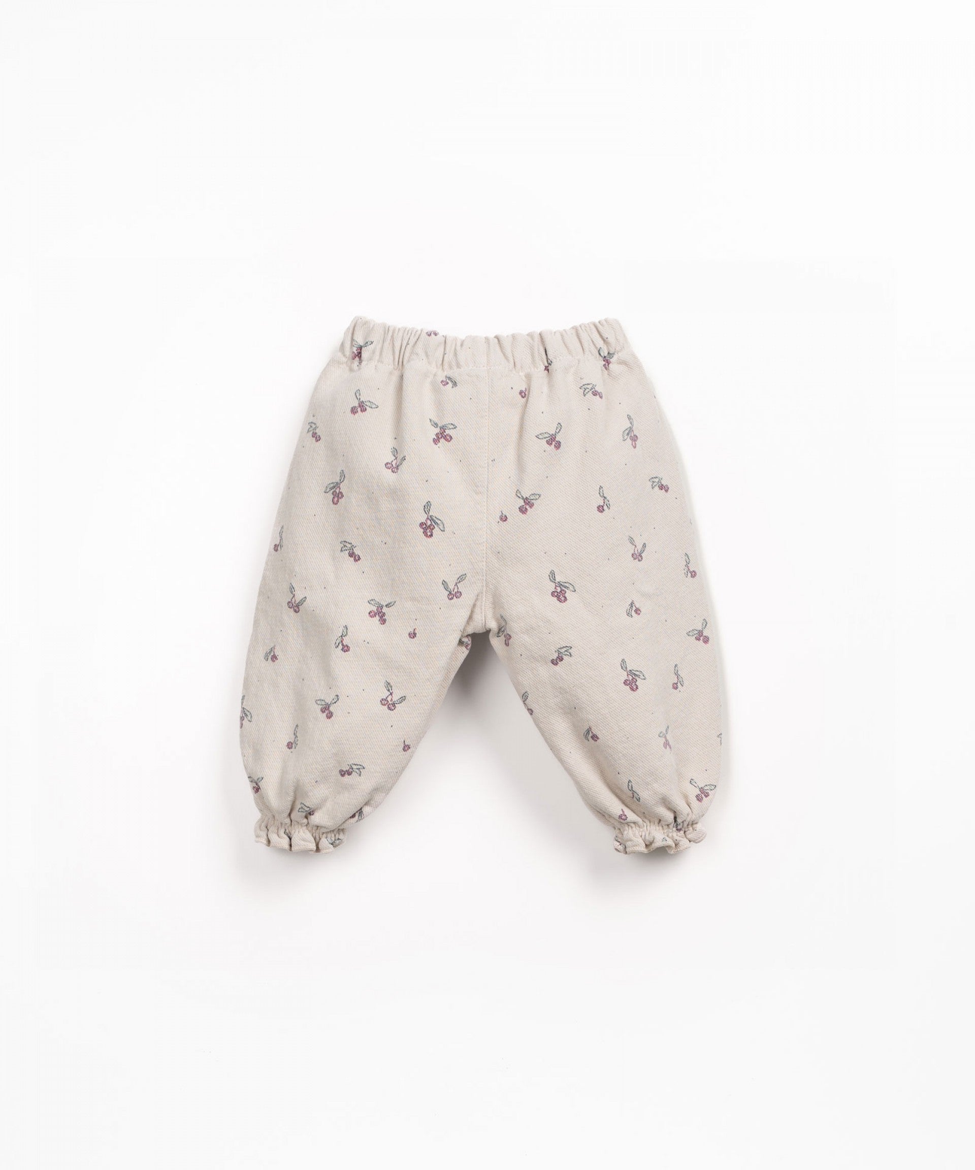 Ensemble sweat en molleton fabriqué en maille, modèle à manches longues, avec col large appliqué et ouverture au dos avec bouton en coco (74% Coton, 13% Coton Recyclé, 13% Polyester Recyclé) et pantalon à taille élastique et motifs de fruits (100% coton).