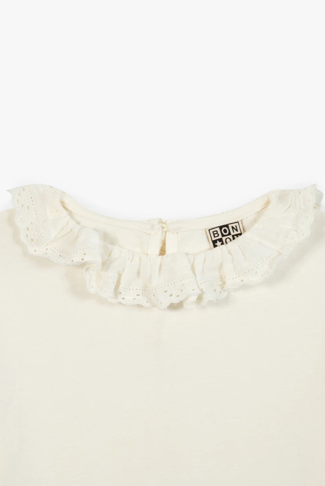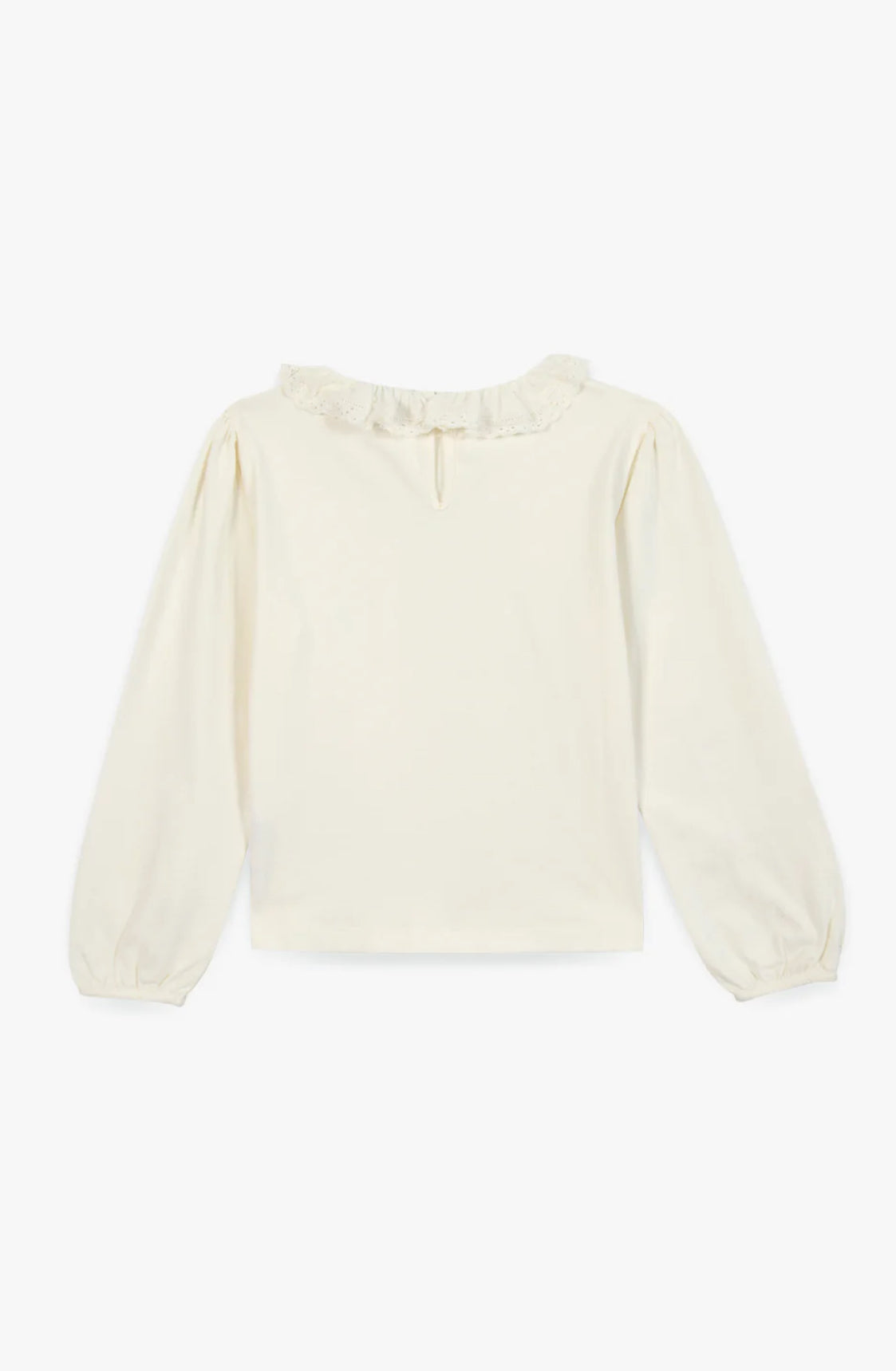 Tee-shirt manches longues écru avec col volanté et ajouré.