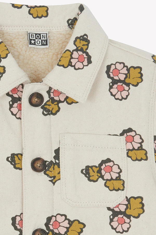 Veste à motifs fleuris et col pointu. Doublure sherpa et fermeture à boutons.