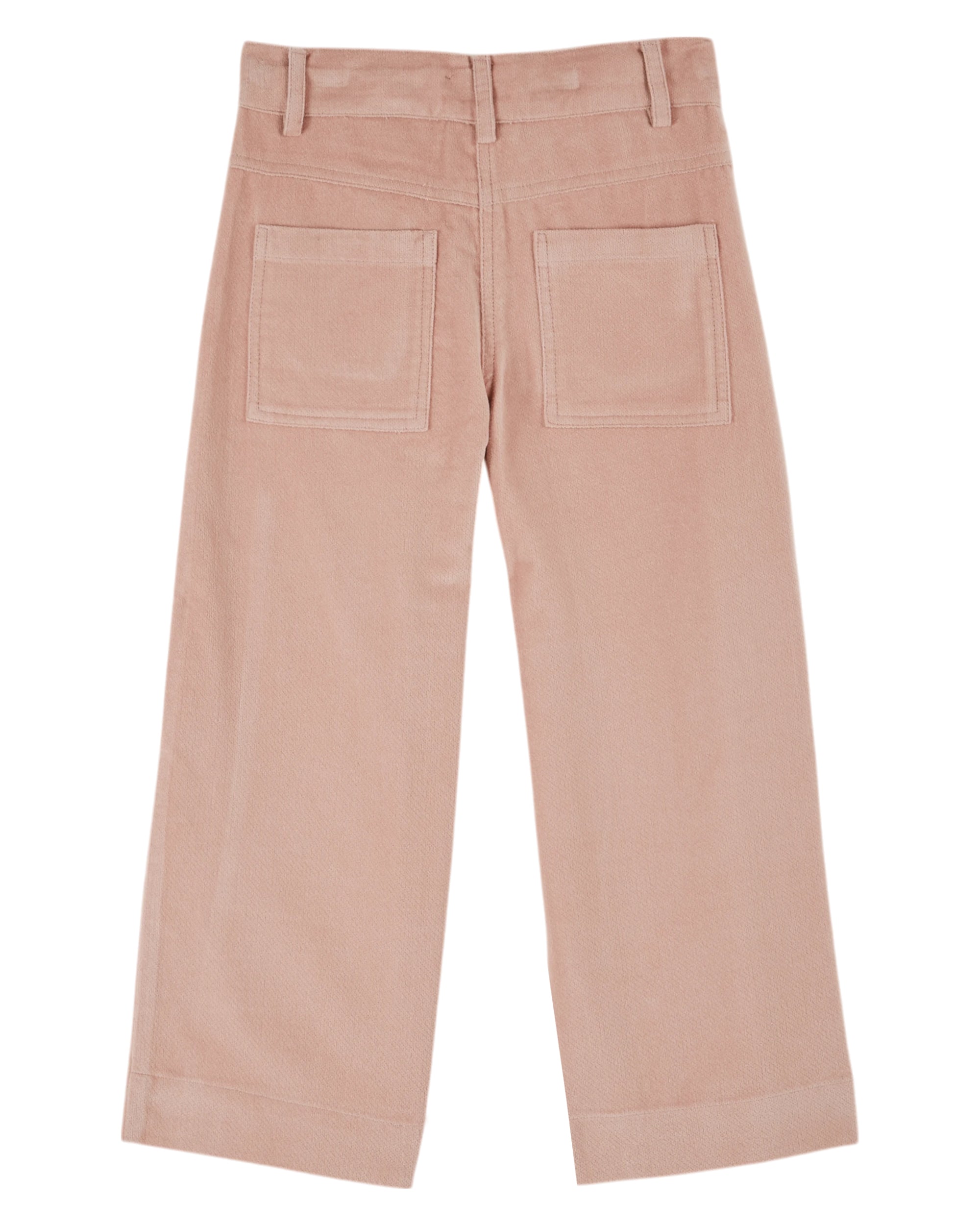 Pantalon en velours coupe droite couleur rose clair avec deux poches plaquées sur le devant et brodés d'une fleur.