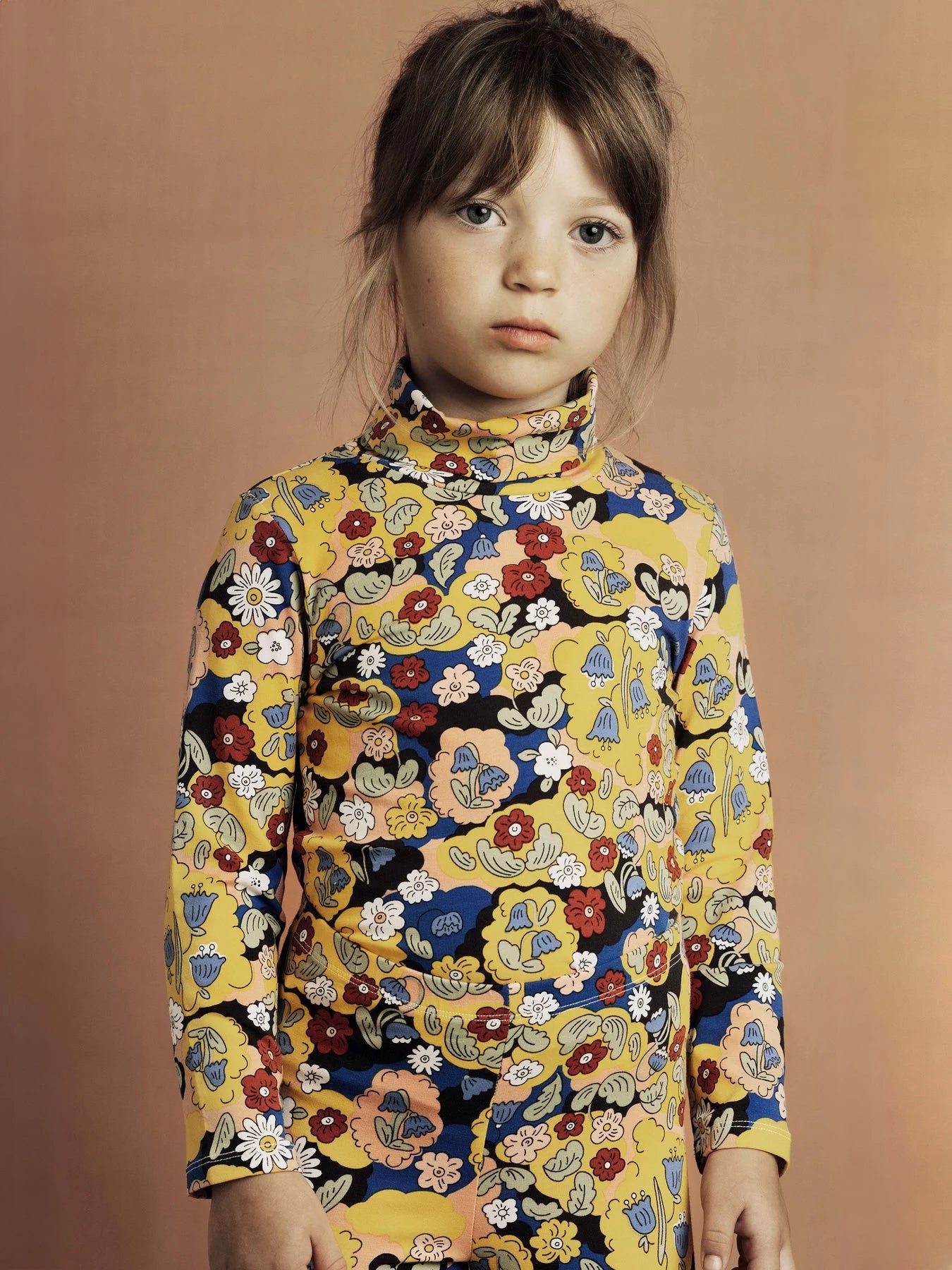 Ensemble tee-shirt manches longues avec col roulé et legging évasé avec taille élastique, imprimé fleuri multicolore.