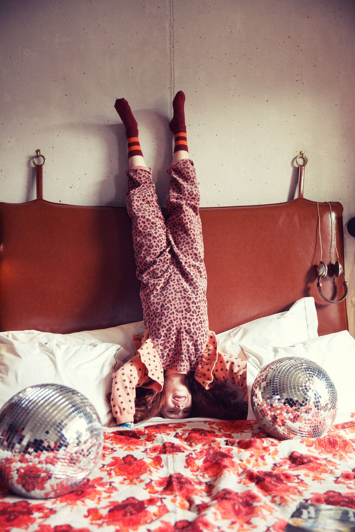 Salopette rose en velours côtelé avec imprimé léopard. Bretelles en ruban noir ajustables. Deux poches plaquées sur le devant et une à l'arrière.