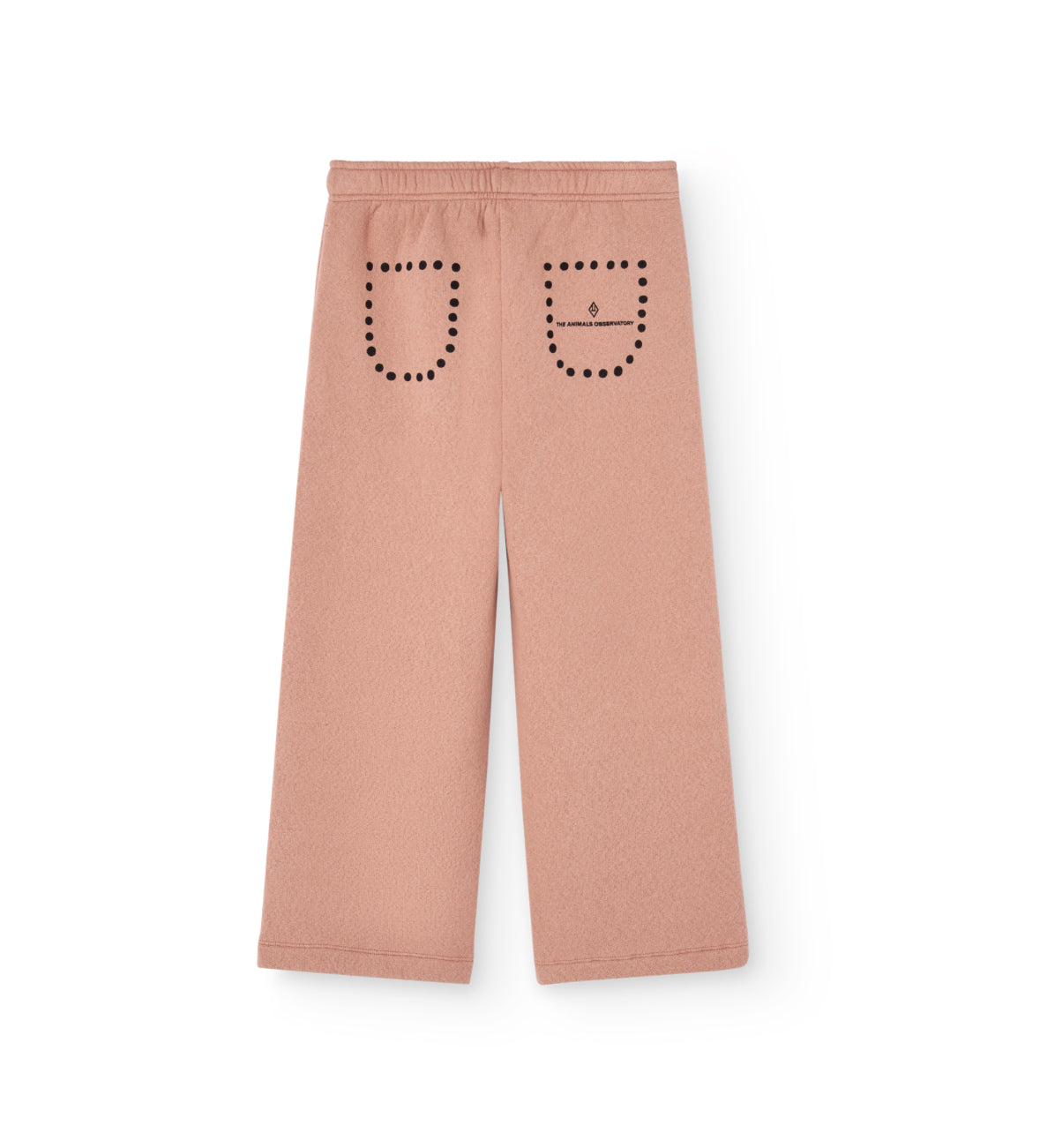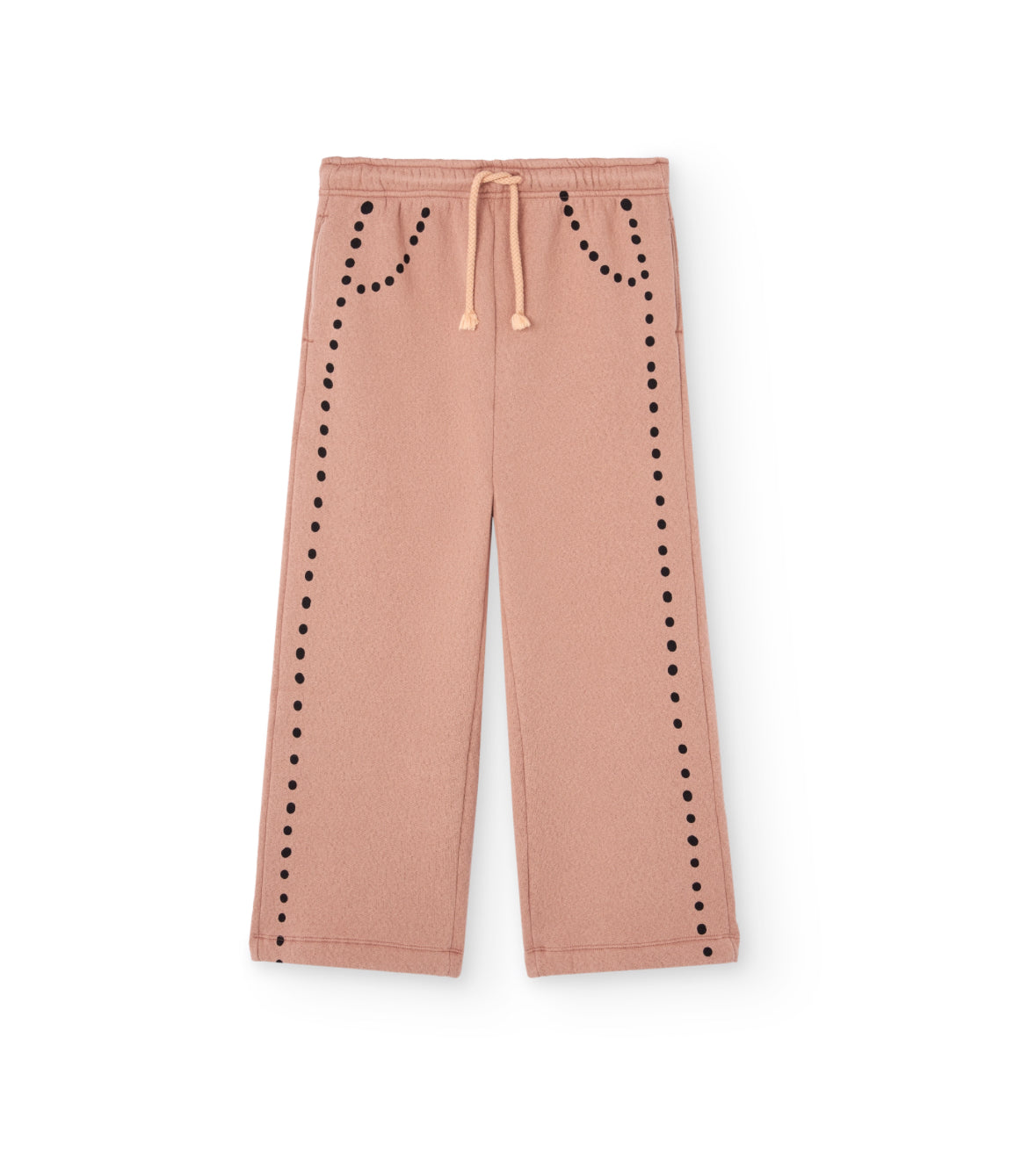 Des pois élégants mettent en valeur ce pantalon corail poudré décontracté, un incontournable de la mode enfant automne-hiver 2025.